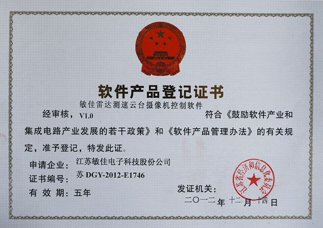 2012年1214號,我公司獲得了由江蘇省經濟和信息化委員會頒發的軟件產品登記證書。此次,又有二個產品經審核符合《鼓勵軟件產業和集成電路產業發展的若干政策》和《軟件產品管理辦法》的有關規定,被認定為軟件產品,其中包括:敏佳雷達測試云臺攝像機控制軟件V1.0、敏佳遠程網絡客戶端控制軟件V1.0